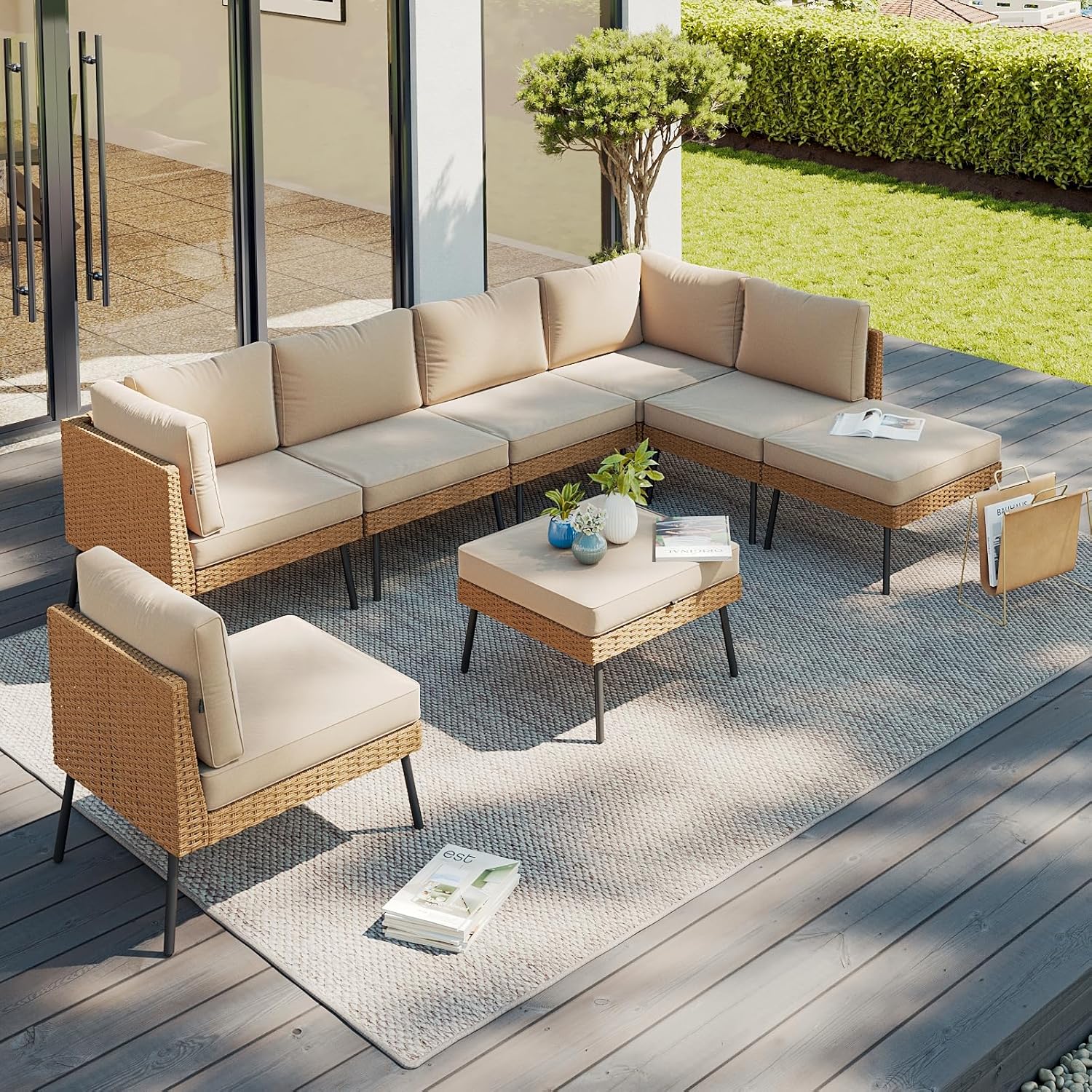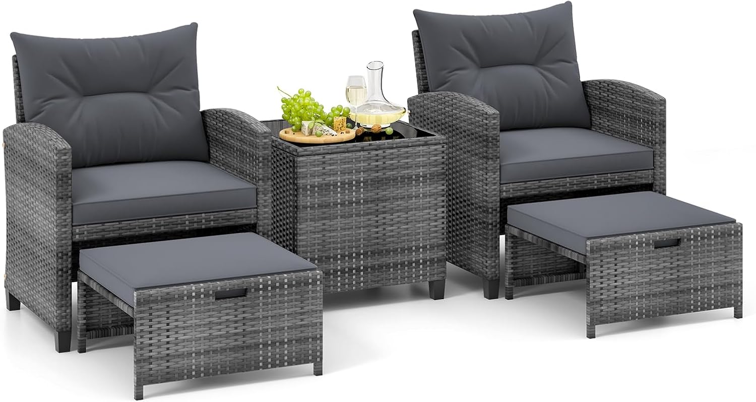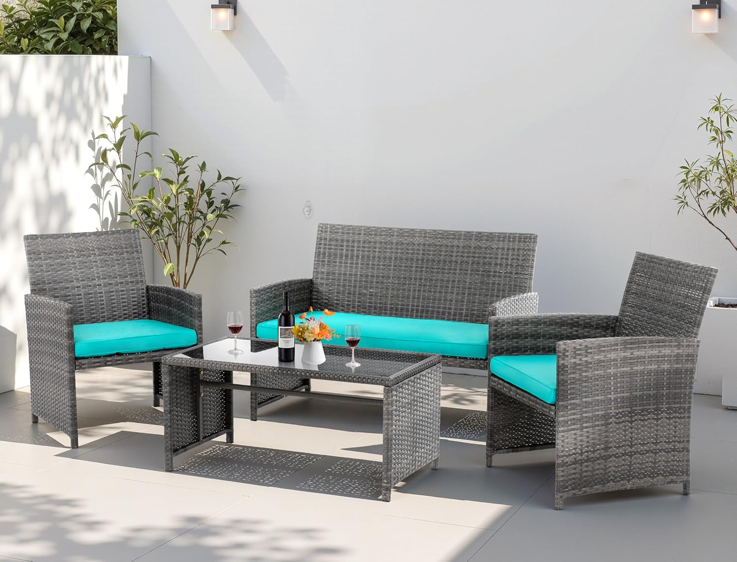 4 Piece Patio Rattan Set Outdoor Furniture Set Wicker Conversation Sets with Cushions and Tempered Glass Tabletop,Blue